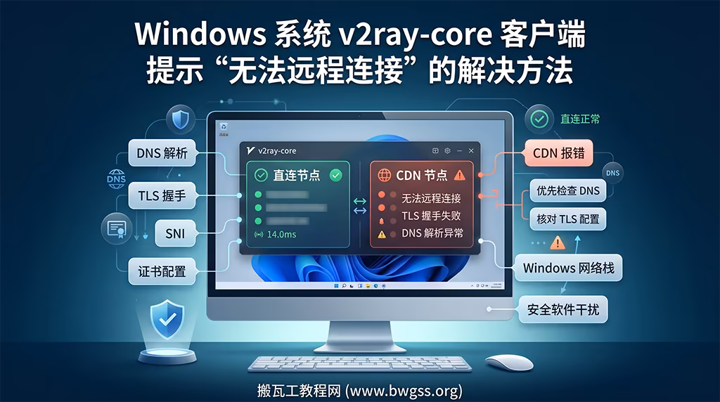 在 Windows 系统里,使用 v2ray-core 客户端测试节点时,如果出现“无法远程连接”“错误”或者 CDN 节点始终没有延迟返回,很多人的第一反应都是服务器出问题了。其实从目前常见的情况来看,这类问题更常出在 DNS 解析、CDN 调度、TLS 握手、serverName 配置以及 Windows 本机网络栈 上,而不是单纯的“节点失效”。搬瓦工教程网就就围绕 v2ray-core 提示“无法远程连接” 这个问题,按照目前仍然实用的办法,讲清楚原因、排查方向和解决方法。