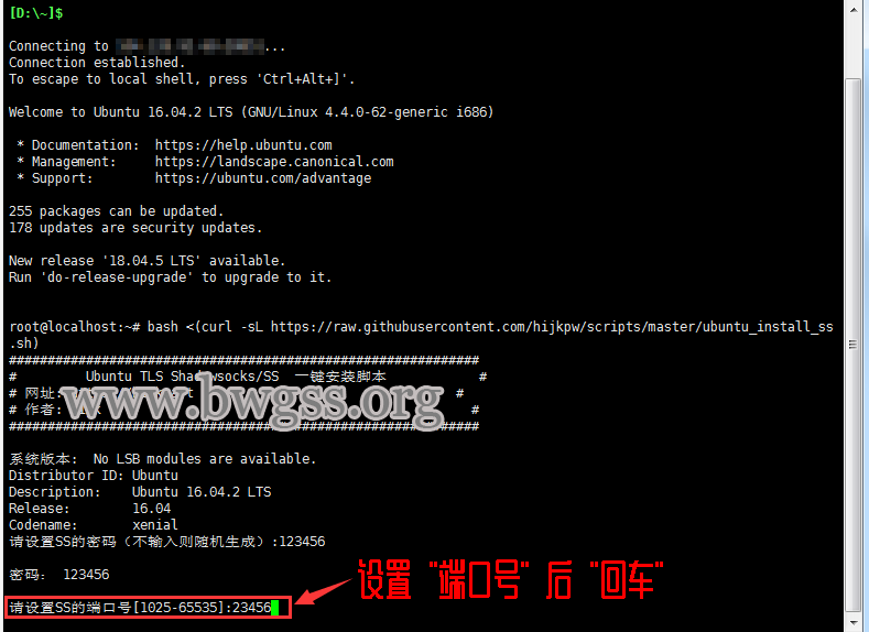 回车后提示“请设置 Shadowsocks 的端口号[1025-65535]”,本站测试教程输入“23456”作为 Shadowsocks 的端口号,大家在 1025-65535 之间输入端口号,如图: