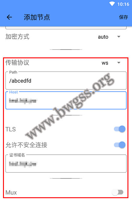 - 传输协议:选择“ws”。